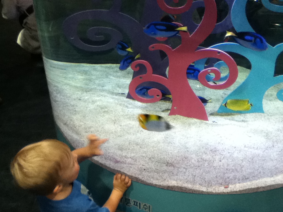 That's the Seoul subway route map....Thank god Myndi had it all figured out:) The train ride was about an hour or so which included a couple transfers and many stops. The good thing is it took us right to our final destination which was the Coex mall. That place was huge, lots of stores and a really big aquarium that had lots of fish for Liam to see. Most of the pictures are of us in the the aquarium, it was pretty neat and they had an impressive array of fish and other creatures. They also had this cool area where they had household appliances that were turned into aquariums, there is a few pics of that too, a fridge, a washer, and a phone booth all have fish in them.